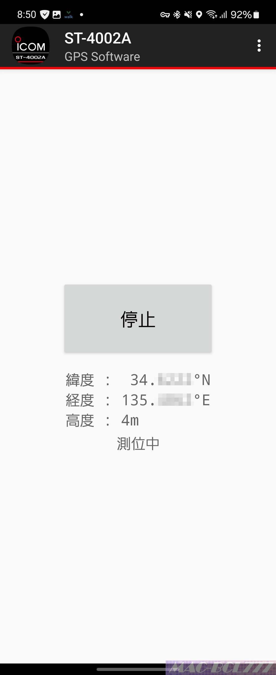 すると、GPS情報に必要な緯度、経度の情報が表示されます。この情報が表示された時点でIC-9700にはGPS情報が転送されています。ちなみに高度は正確ではないですね。私の自宅は43mです。