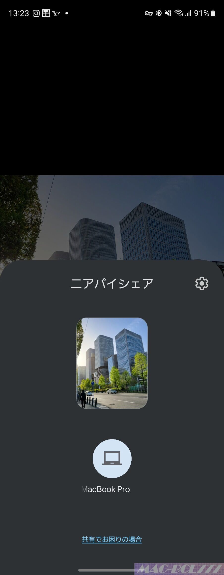 以下の画面のように、iPhoneのAirDropのように、Androidの画面に私のMacBook Proが表示されます。あとはタップして、MacBook Proに通知がきますので、Acceptすればファイルが転送されます。