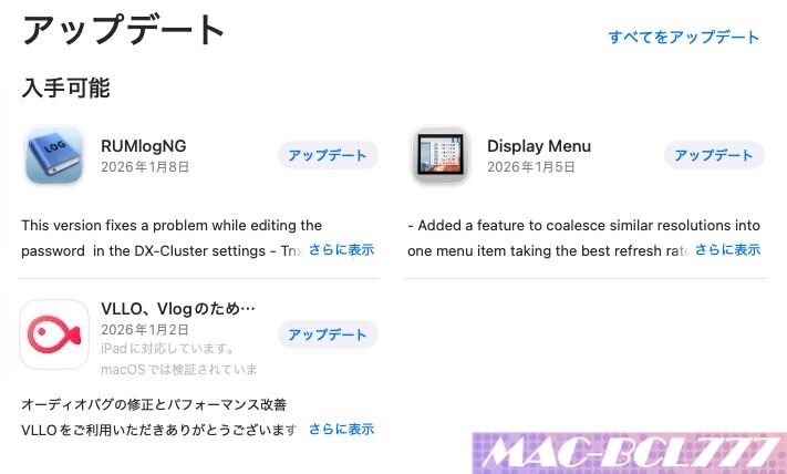 今日はMacBook Proにアプリのアップデート通知が来ていましたので、早速アップデートを行いました。今回のアップデートは、私にとっては重要なアップデートでした。4つのアプリ全て、「CotEditor」、ブログの記事を書く「Upnote」、無線でFT-8をやるアプリの「RUMlogNG」、動画編集するアプリ「Villo」のアップデートでした。まあ、内容は軽微なバグの修正のみでしたが、やっぱりよく使うアプですのでね、ちゃんとアップデートしておくことに限ります。これで、またしばらくは安心でしょう。