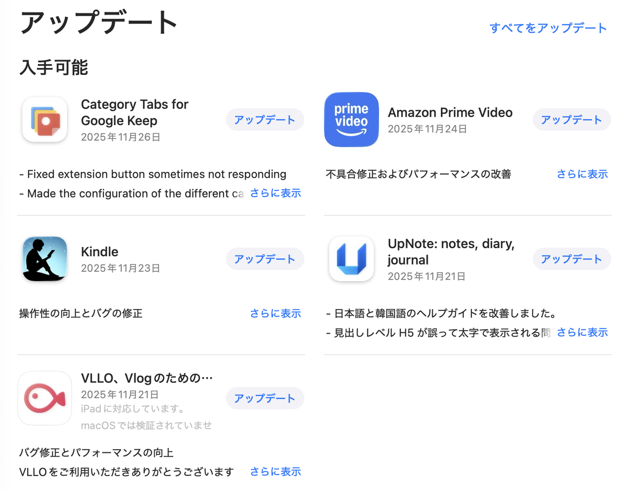6個のアプリのアップデート通知が来ていましたので、早速アップデートしました。私が愛用している「Upnote」がアップデート対象でしたのでね。内容はバグ修正とバックアップ頻度の変更でした。まあ、アプリは最新版がいいと思いますので、アップデートしておきます。