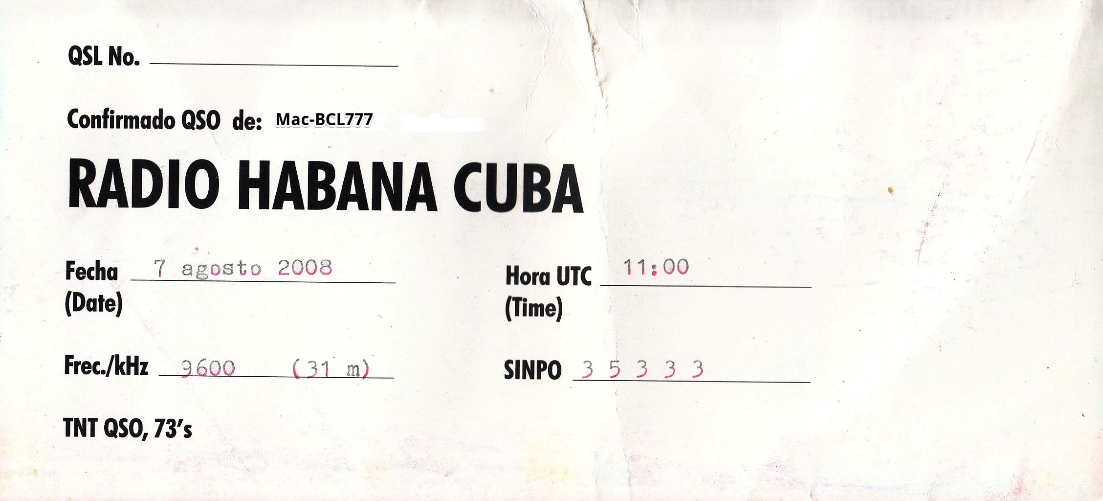 受信報告したのは、2008年、初のスペイン語放送のべリカードです。