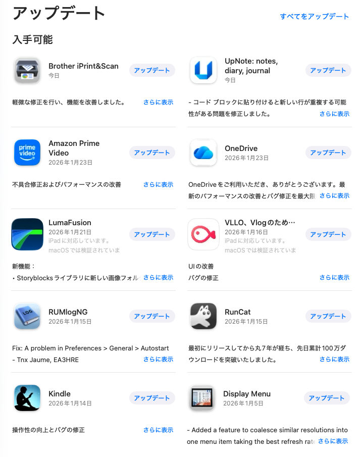 2026年02月17日 Macアプリのアップデートをしました! こんにちは!Mac-BCL777です。 MacOSに10個のアプリのアップデート通知が来ていましたので、早速アップデートしました。愛用しているUpnoteのアップデートが来ていましたので、最新にしておかないと・・。修正内容は、Mac版でウィンドウサイズがまれに変えられなくなること、貼り付けた動画をノート内でドラッグして移動させようとすると、画像がまれに消えてしまうこと、その他細かいバグ修正のようです。ということでアップデートしました。