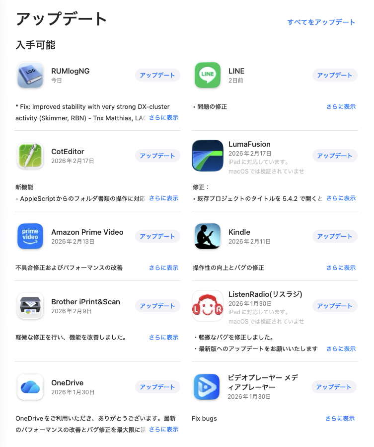 2026年02月26日 アプリのアップデート こんにちは!Mac-BCL777です。 Macにアプリのアップデート通知が来ていましたので、早速アップデートしました。今回は多くて10個です。よく使ってる「RUMlogNG」「CotEditor」のアップデートリストに上がっていましたので、今回は特に。と言いつつ、最近FT-8ができない環境になりましたからね・・。しかし、アップデートはしておきます。